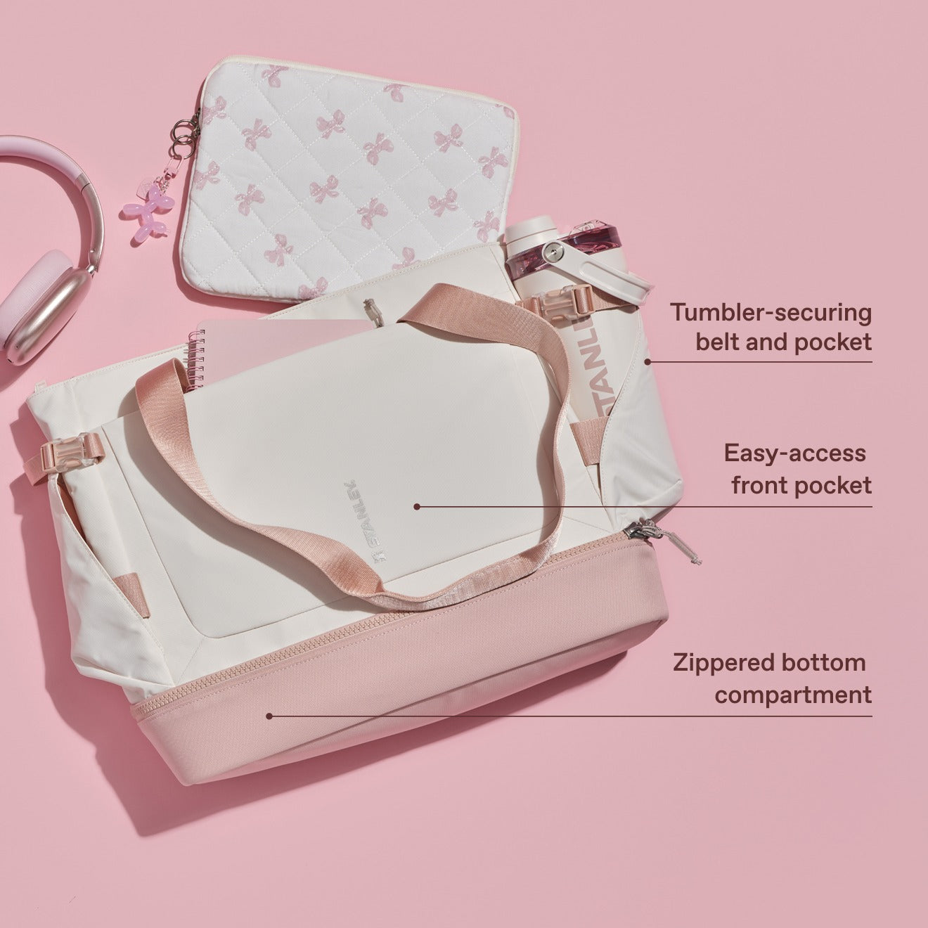 This tote bag with a water bottle pocket is designed to secure your 40-ounce Quencher® ProTour, Vitalize™ Shaker Bottle, and more. The exterior tumbler securing belt makes it a true tote with a water bottle holder meaning no tipping and no digging.
